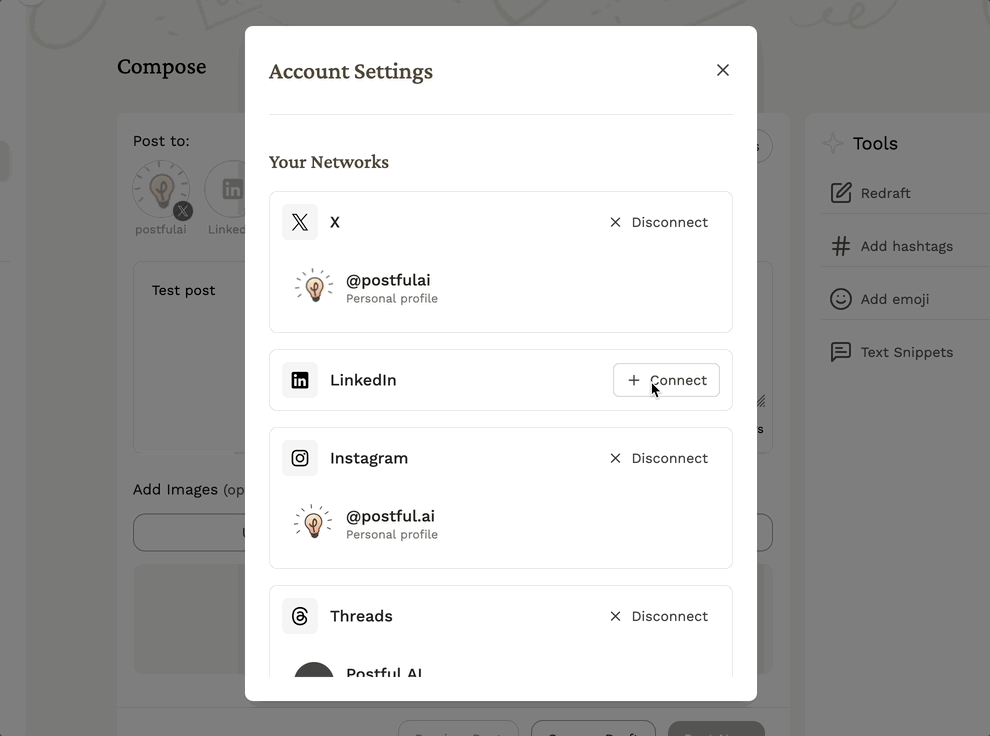 If you want to use voice input with Postful, the easiest way today is to pair it with Superwhisper. Dictate your ideas directly into Postful, then let our AI help refine, draft, and syndicate them.